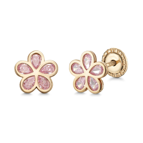 14k Yellow Gold Flower Stud Earrings with Simulated Pink Gemstone, Covered Screwback Closure for Girls and Women