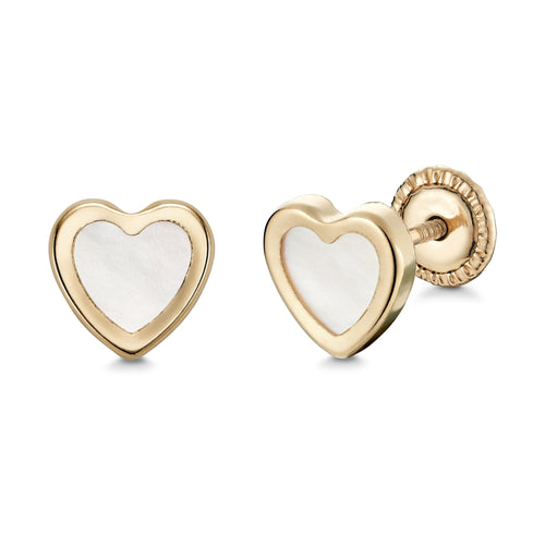 14k Yellow Gold Heart Stud Earrings with Mother of Pearl - Covered Screwback Closure for Women and Girls